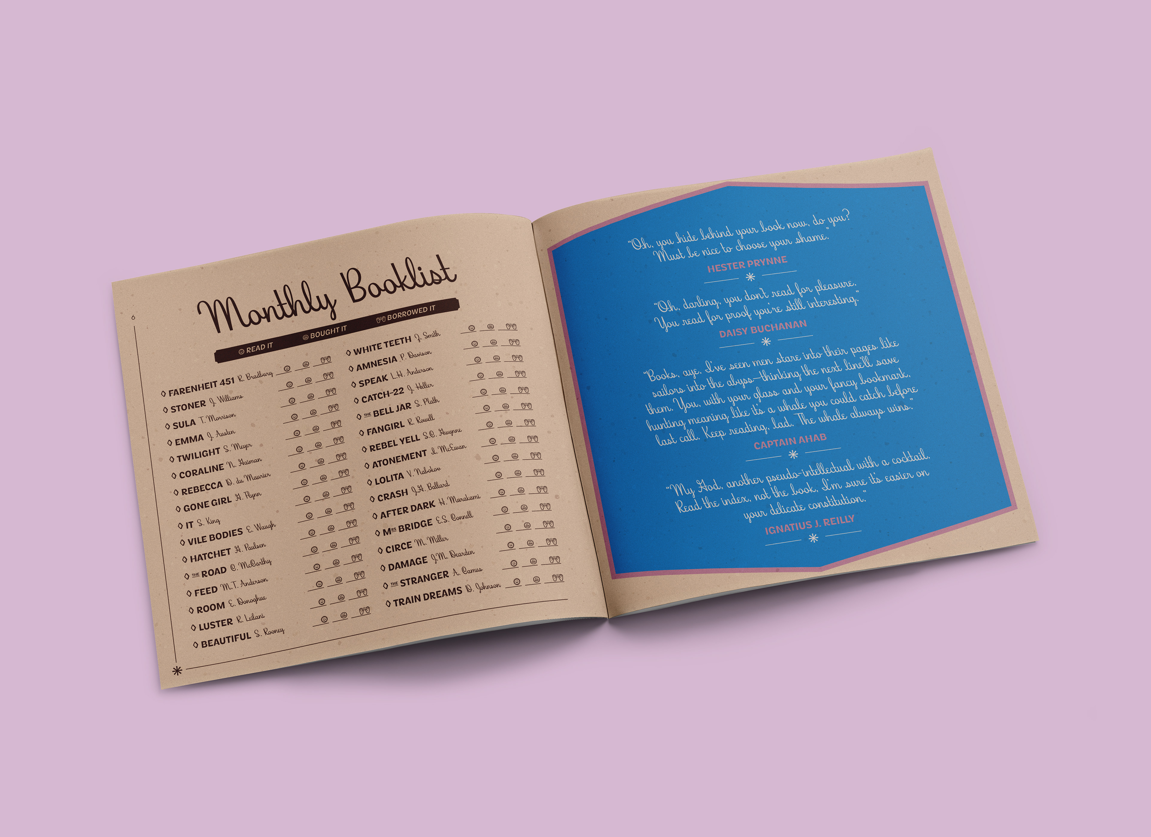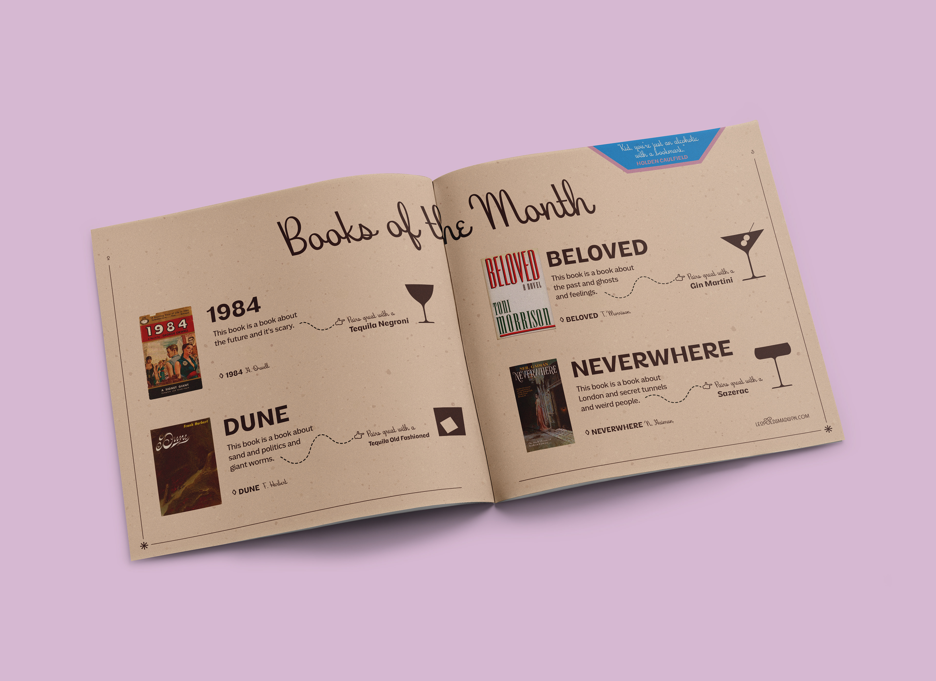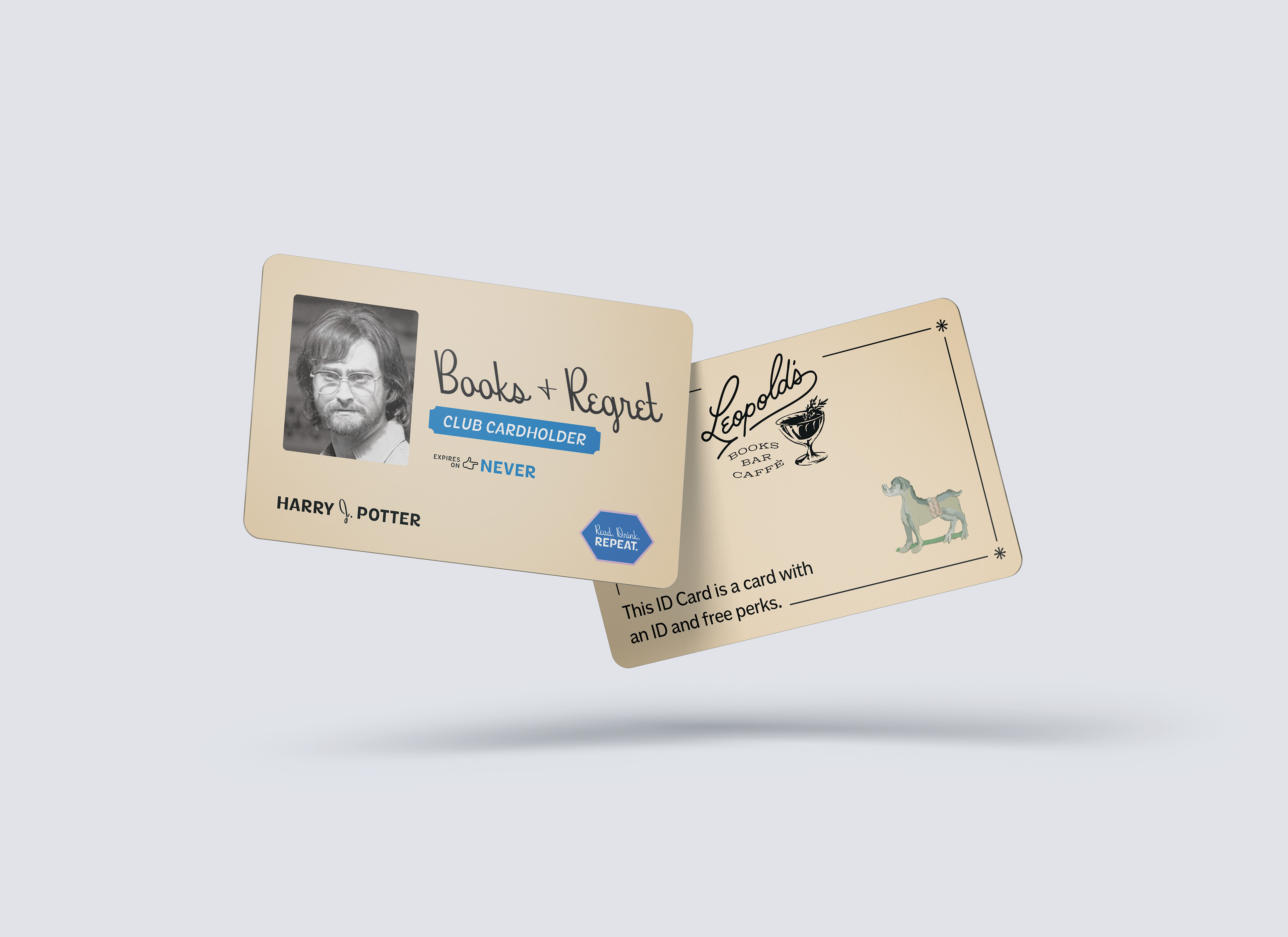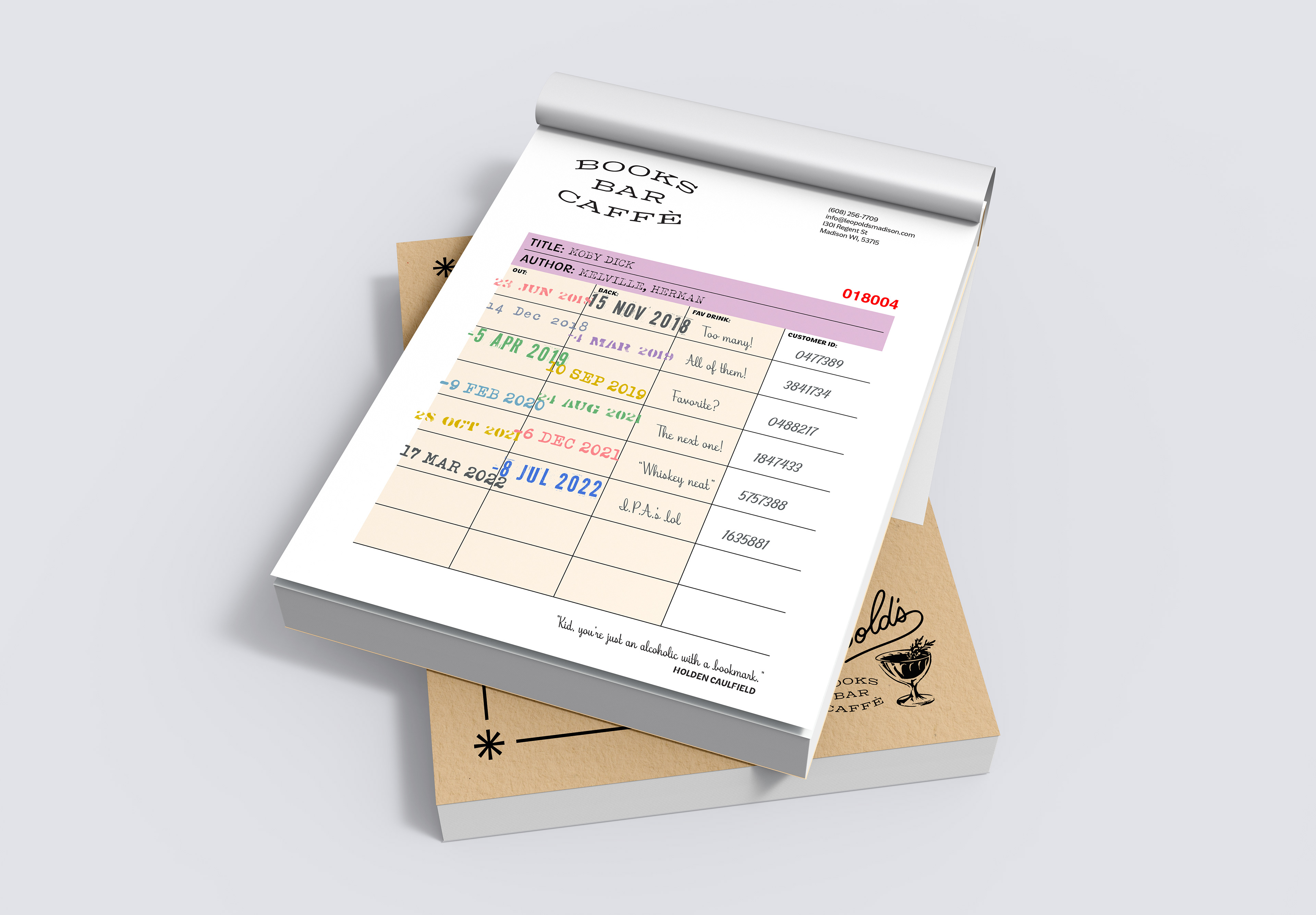 Leopold’s is a bookstore, café, and cocktail bar with a warm literary atmosphere and a devoted crowd. For this project, I created a branded monthly book club kit built around a tongue-in-cheek membership concept. The kit includes a booklet, buttons, a custom box, ID cards, and a bar-tab/library-stamp hybrid — all designed to blend book culture with a wink.
