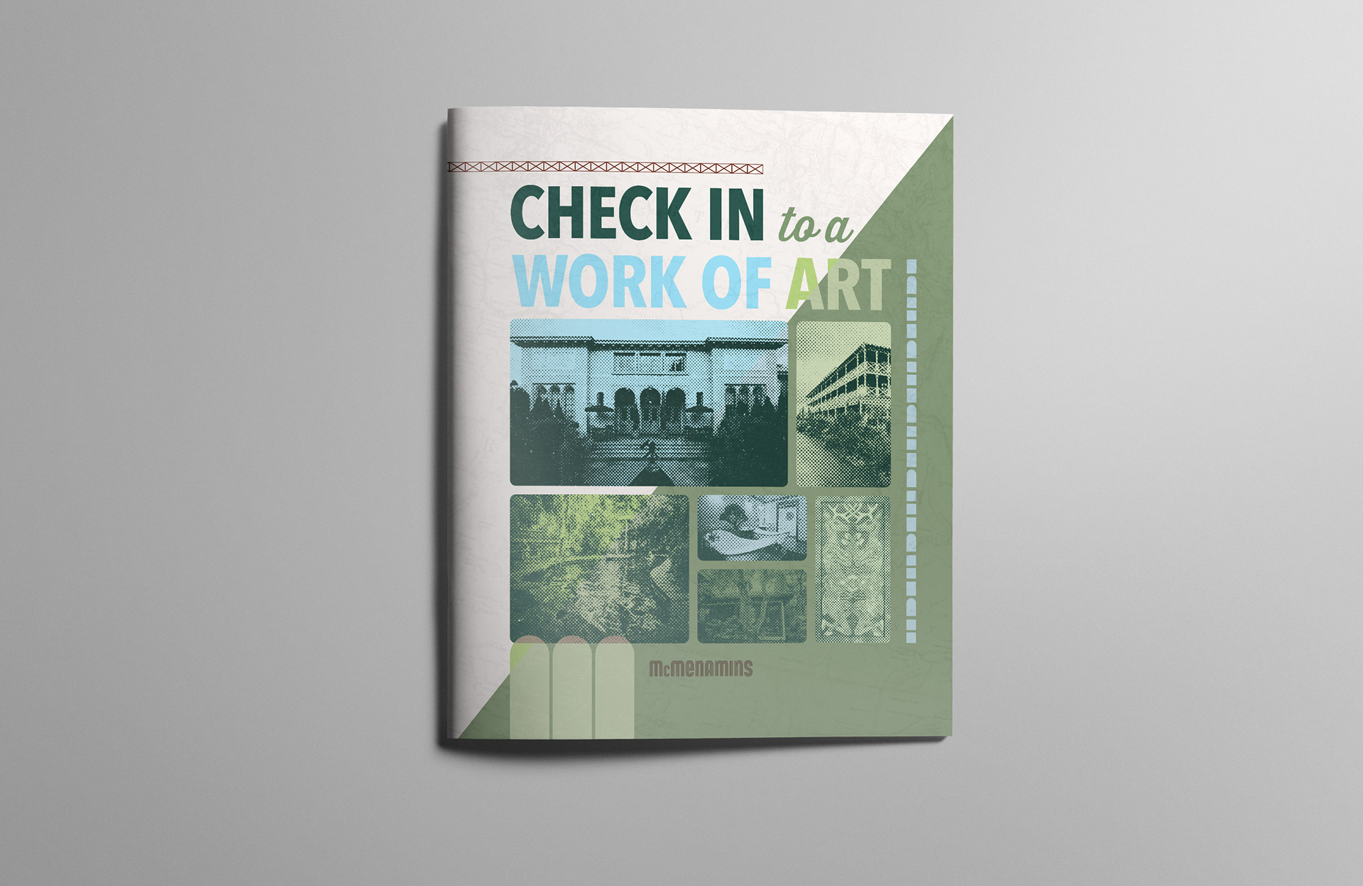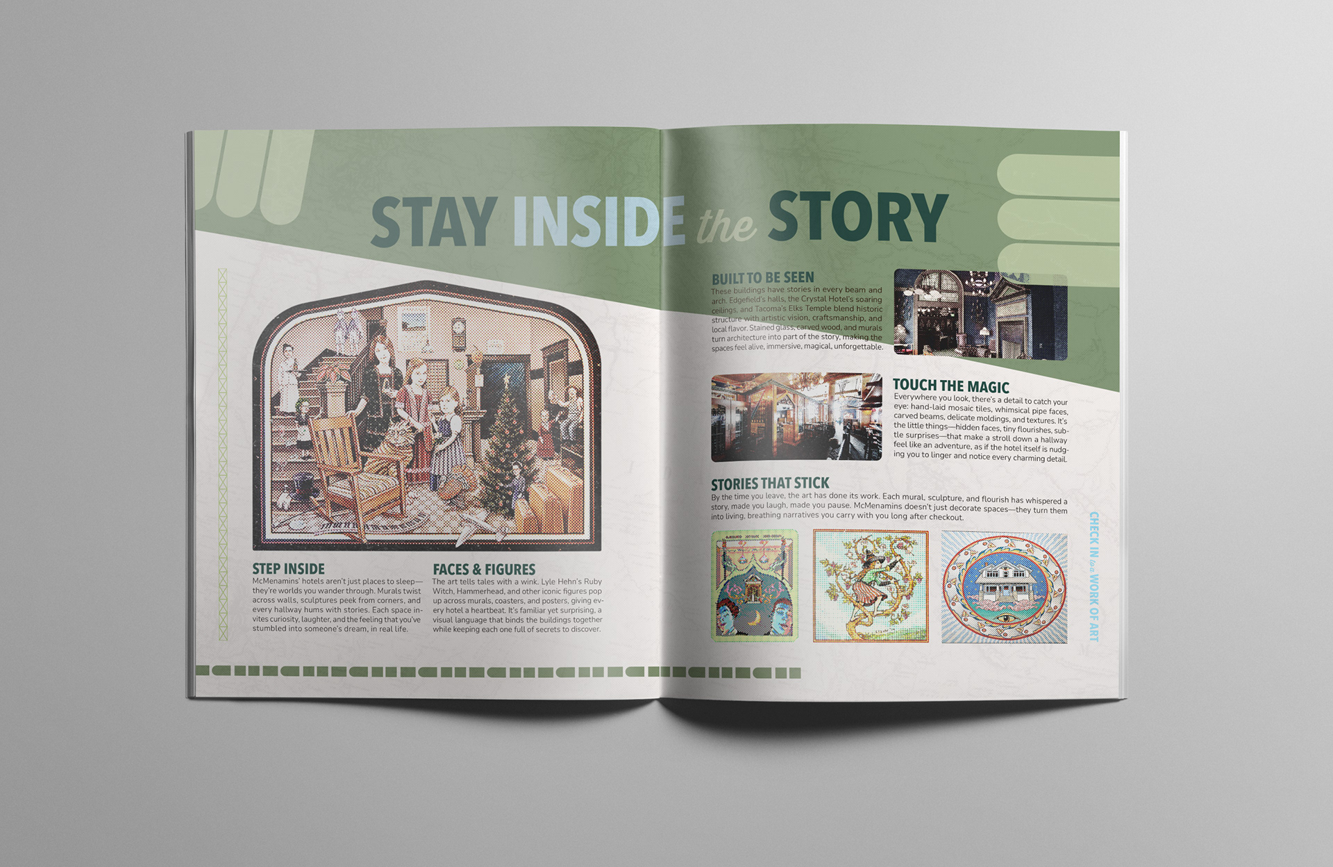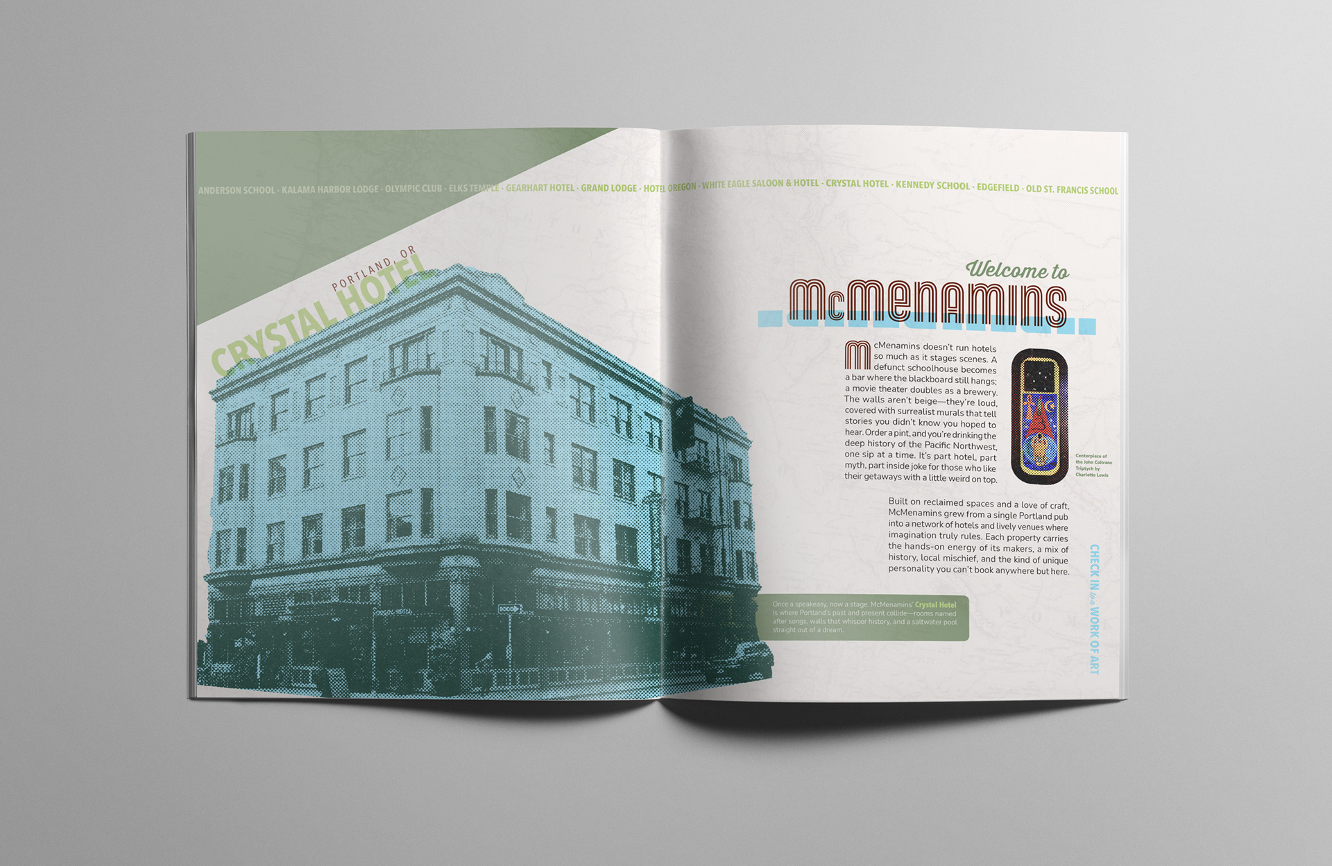 While McMenamins is rich with spirit and story, I wanted to imagine how a refreshed visual direction could capture that same magic in a new way. This brochure leans into an abstract, gritty, underground feel while still holding onto the whimsical, artistic playfulness that gives McMenamins its unmistakable character.