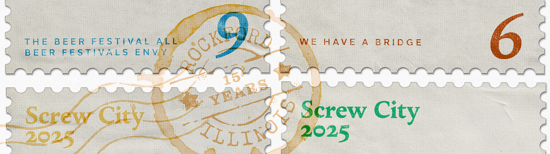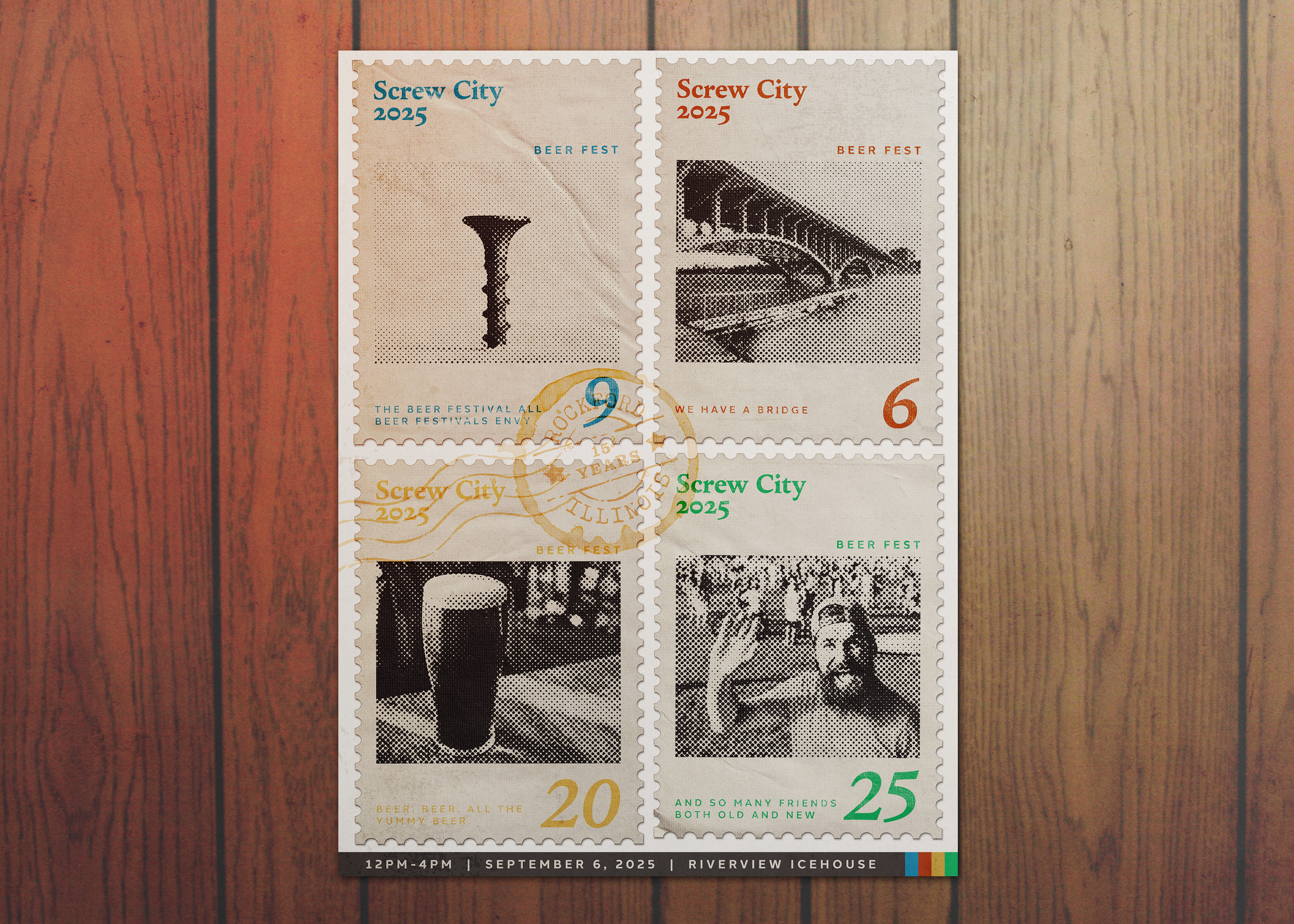 It’s easy to picture a beer festival being fun—but much harder to show what makes one truly original and woven into its community fabric. I designed this poster to capture what sets the Screw City Beer Festival in Rockford, Illinois apart. I aimed for individuality and a sense of discovery, giving the piece a memorable, collected-over-time feel. The textured, four-stamp layout pulls from vintage poster and stamp design to bring that spirit forward.